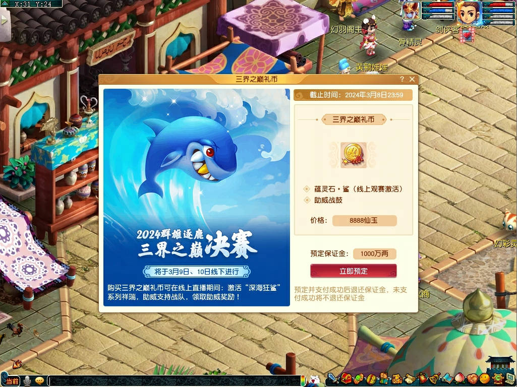 为了确保能够参与购买,少侠们记得前往宝象国(28,23)的三界之巅使者处,支付1000万两订金进行预订购买资格(无需全面解锁),预订成功的少侠在24小时内完成仙玉支付,则可以将1000万两预定金的全额返还。