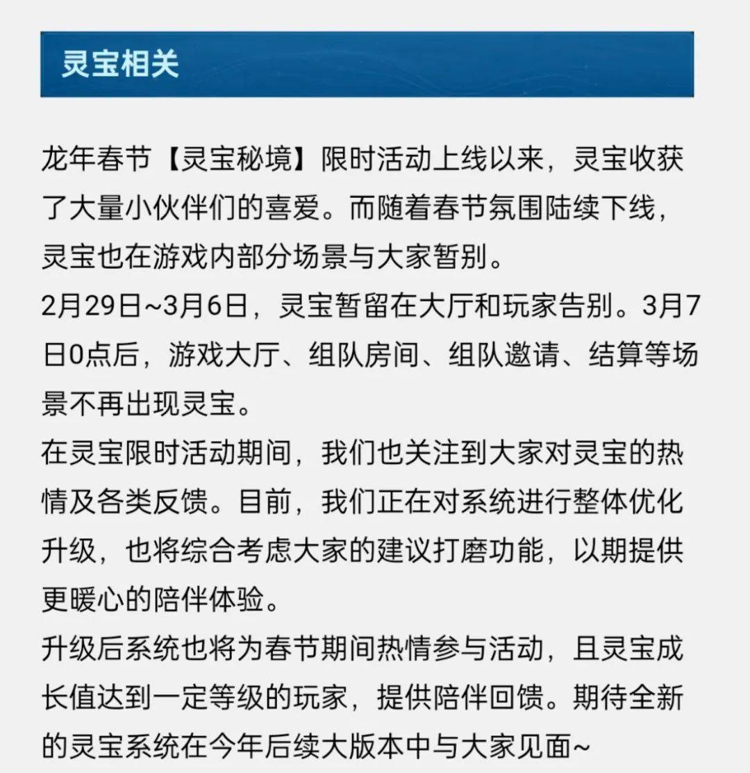 另外,春节期间的灵宝让大家印象深刻,普通玩家并没有机会拿到永久灵宝,所以感触不是特别深。但是那些花了真金白银去刷的玩家而言,在灵宝活动结束之后,无法主动召唤灵宝的设定,让无数氪金玩家吐槽。对此,其实小王一直没有做过正面回应。不过随着灵宝的下线,这一次小王做出了回应,之后灵宝还会回来,以全新的方式继续回来紧盯玩家们的荷包。养电子宠物这样的摇钱树,不可能放过。这本来就是他们的拿手好戏。