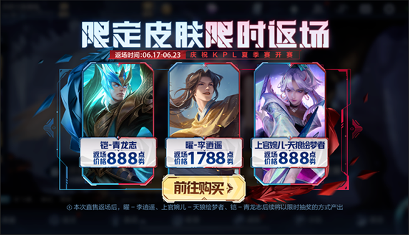 我特意去查了一下,发现那一次返场,一共有三款皮肤,除了曜李逍遥和铠青龙志之外,还有上官婉儿的天狼绘梦者。而返场的名头是KPL夏季赛的开赛。那也是KPL改制之后的首次夏季赛。