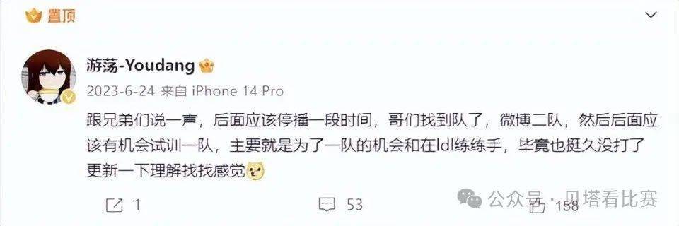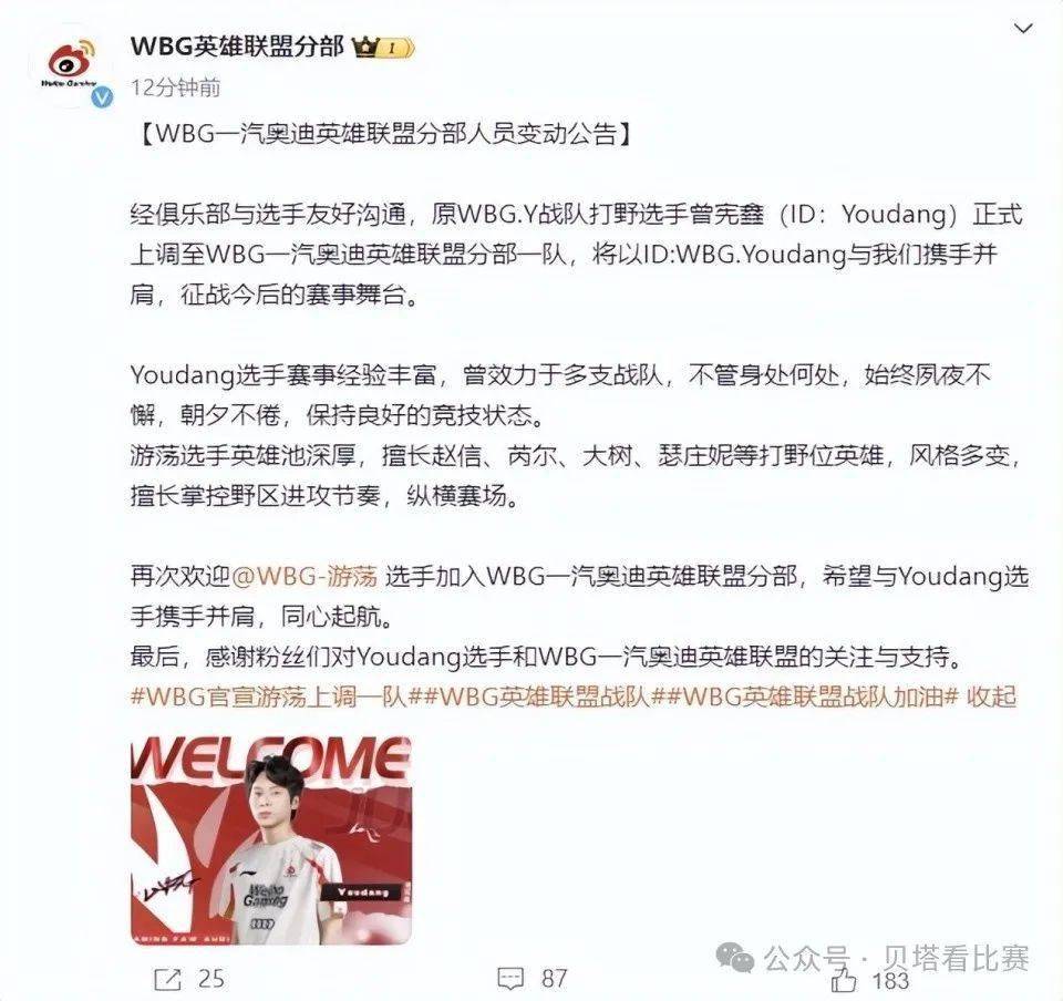 具体消息如下,WBG官博在6号晚上发布官宣,表示二队打野youdang正式升至一队,将和一队携手并肩,一起征战后面的比赛。