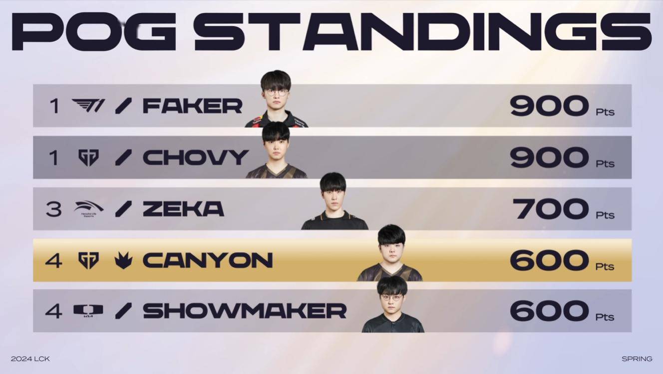 今年韩国LCK春季赛的POG榜单,前几名基本上都被中单霸榜了。在今天Canyon拿到了第一局MVP之后,他也是成为了唯一一位进入前五的打野选手。其他4人分别是Faker,Chovy,Zeka和Showmaker。很快在第二局结束之后,由于Chovy的狐狸表现太出色,他也是拿到了个人第1000点POG,暂时超越了Faker成为了常规赛MVP第一名。