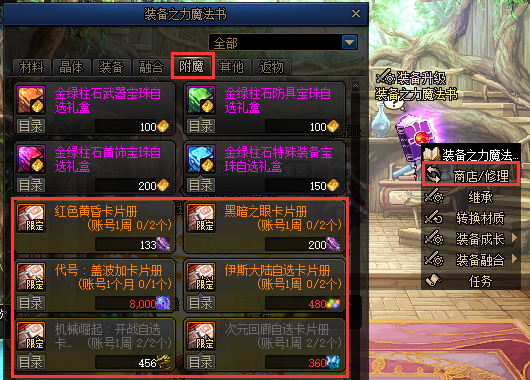 通过“魔法书商店-附魔”页面,可使用相关材料兑换各类卡片册。