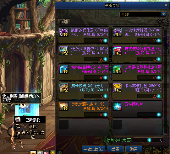 每周可入场三次,有几率产出“一次性增幅器、小号宠物装备”等道具,商店内也有各类道具供给兑换。