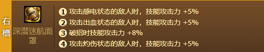 右槽部位,在当前版本唯一T0强者,绝对深潜迷航面罩,毕业词条为破招8技攻、异常5技攻、直伤4技攻。只要爆出了胚子,那赶快洗起来吧~在未来装备改版后,相关触发条件均会被移除,更方便使用,妥妥的数值怪。