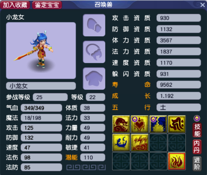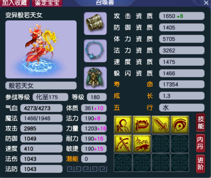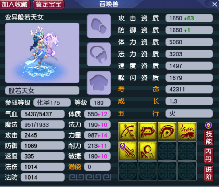 因为般若姐姐最高技能有6个,所以很多股东会非常执着的去洗6技能变异般若,比如这只,攻防资质都已超过了1650,成长也达到了1.3满成长,蓝色的外观更担得起“出尘脱俗”的描述,这样的宝宝陪伴咱一起刷任务,还有什么怨言呢?