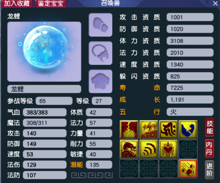 这只雷龙算得上非常非常完美的任务宝宝。无论是技能搭配还是资质都非常优秀,1462的速资配合高级敏捷甚至能快过一些任务法系。高级法术连击作为套装技能算得上点睛之笔,在一些伤害溢出不需要高级法术连击补伤害的活动中(比如十八门派闯关),完全可以换成高级感知等更具性价比的套装。