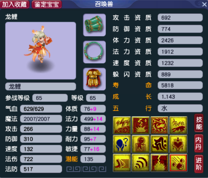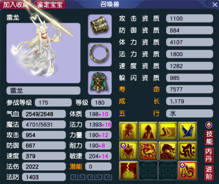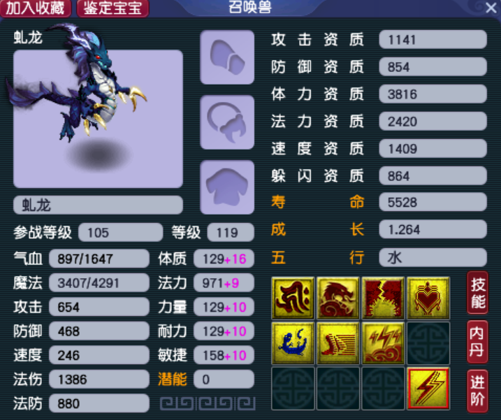再来一条有证的虬龙,这只虬龙的定位是任务顺势须弥,1409的速资配合高级敏捷保证风气龙游的技能效果,套装可以选择高级法术波动,毕竟神威的任务须弥普遍不喜欢高级法连。另外,小美喜欢这只虬龙,还因为他的法术是奔雷咒,咱龙腾九天,不搭配天雷滚滚,多少有点不够霸气,各位股东你们说是不是。