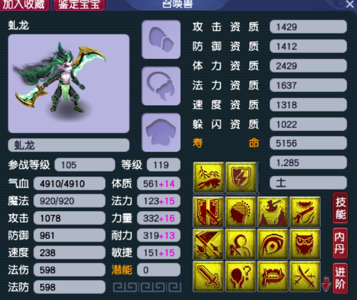 虬(qiú,不是渣哦)龙是神威组最常见的龙宝宝,和蛟龙的“一脸正气”相比,咱虬龙主打一个“痞帅”。这只虬龙虽然没有招牌风起龙游,属于“无证上岗”,但架不住咱技能多呀,壁垒力劈搭配法术防御,各种辅助技能应有尽有。14技能配合1429的攻资、1412的防资和逆天的1.285成长,这样生存拉满的壁垒力劈宝宝,登个群雄逐鹿大舞台还不是轻轻松松?