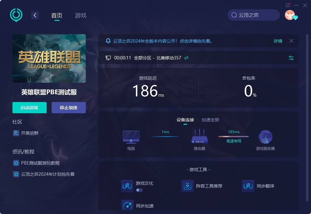 第二步:搜索云顶之弈pbe服并开启网络优化,优化完成后可以正常登录游戏;
