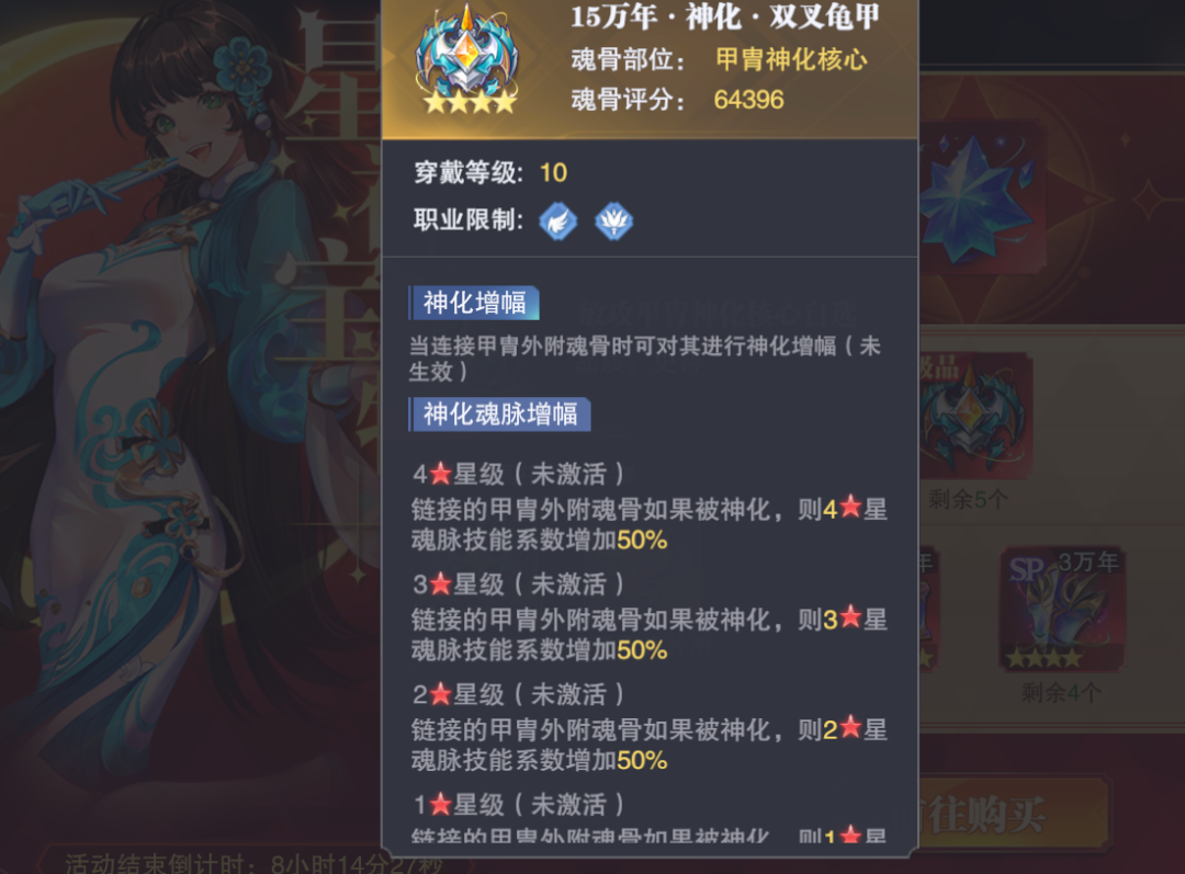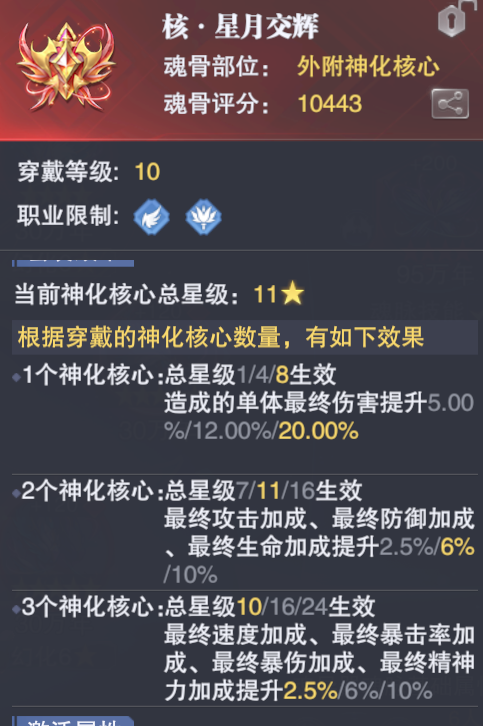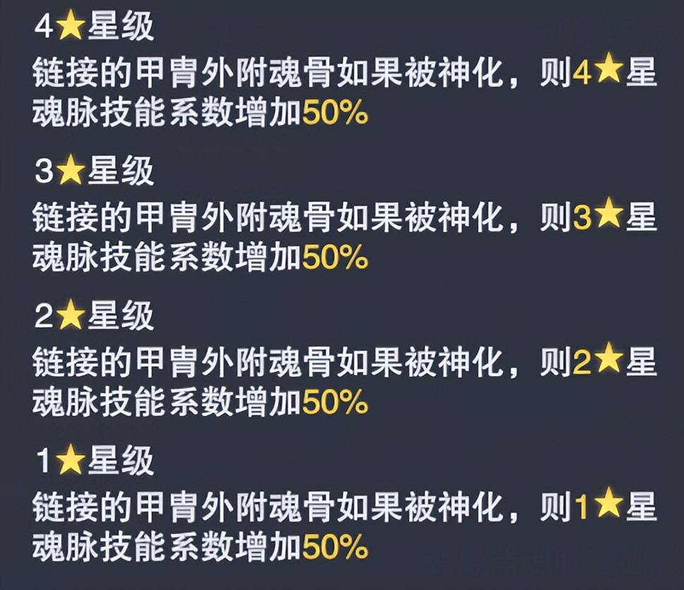 那么除了属性提升外,基本上这个核心还有两个作用,第一个是和背部、面部核心一样的可以提升相关“神化”后的外附魂骨的魂脉效果,提升量统一为50%,这点虽然看着还行,但是大家需要注意这里有2个前提,第一是需要将对应部位的外附魂骨进行神化,而神化后的外附魂骨是无法重铸的,这点大家注意取舍;其二则是神化核心的星级也决定了它能够对应提升魂脉的上限,比如黄色2星的神化核心就只能提升对应部位外附魂骨黄色2星的魂脉效果50%,更上的3星、4星乃至于红色星级就暂时提升不了,需要后续升星后才能提升。