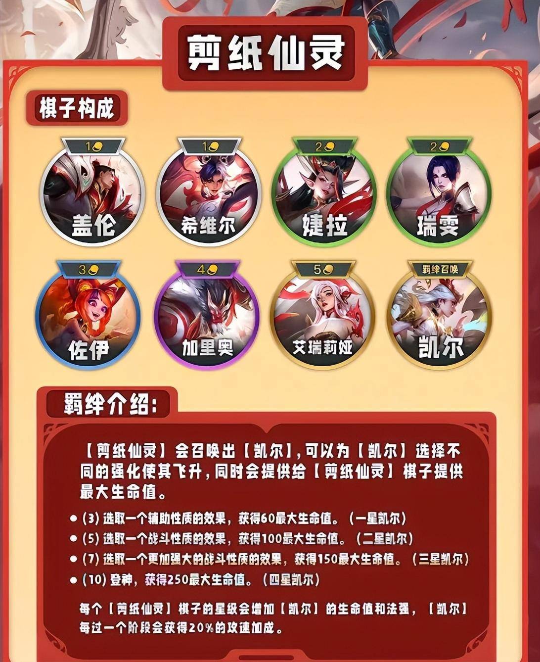 第二个就是全网都在吹最强的隐藏T0剪纸仙灵,由盖伦,希维尔,婕拉,瑞雯,佐伊,加里奥,艾瑞莉娅组,牵绊的主要特效在于能召唤凯尔.星级越高凯尔就越强,所以玩这个阵容必须把牵绊的人物全部登场才行,据主播反馈,暂时没有好的克制阵容,能有一战的只有福星赌狗阵容,运气好的就能中后期压制.