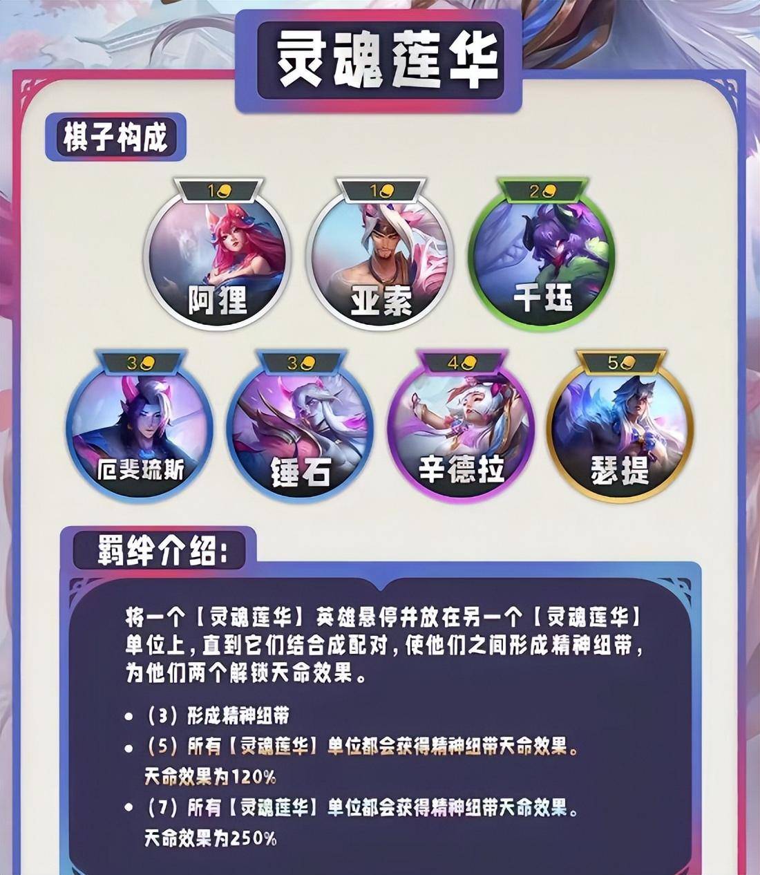 第一个就是全网都在喊的灵魂莲华,由阿狸,亚索,千钰,厄斐琉斯,锤石,辛德拉,瑟提组成,其中的牵绊就不用多说了,强到离谱.