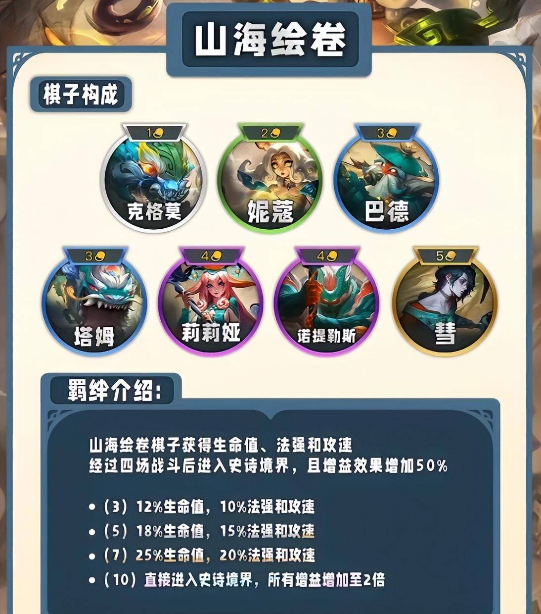 第三个就是热度没有前面两个大的山海绘卷,由克格莫,妮蔻,巴德,塔姆,莉莉娅,诺伊利斯,慧组队,这是一个后期非常可怕的阵容,不仅全员血牛,法强和攻速都非常恐怖,前期会有点弱,但熬过了中期就开始发力了.