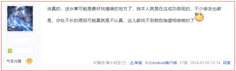 除了自荐的玩家之外,也有不少热心的《逆水寒》网友给妹子出起了主意,一部分认为可能是这位女玩家的要求过高,导致之前的情缘都无法坚持。