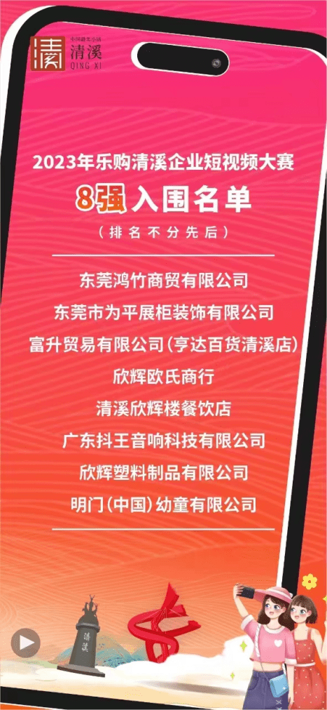 2023年乐购清溪短视频大赛线上比赛期间,大赛在各界的关注下反响非常热烈,海选赛经过层层选拔,共有16位企业伙伴进入了半决赛,此次半决赛,由线上人气决定入围名单,经过激烈角逐,共有8份作品脱颖而出!现将前8强名单公示如下: