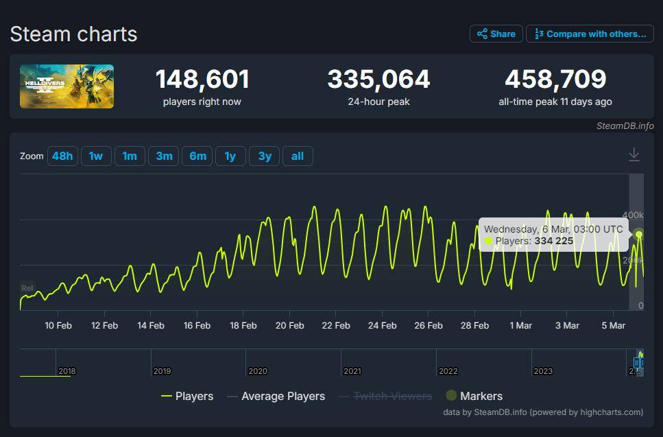 事实上,据SteamDB网站显示,《绝地潜兵2》的在线人数峰值是在下滑的,已经从上周的43万跌到了本周的33万。
