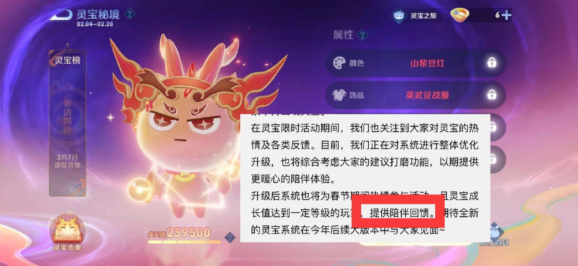 而且根据官方后续的文案来看,其实其他玩家也不用说风凉话,因为灵宝后续还是会再次返场的。这次灵宝系统彻底下架,只是因为这个功能春节期间测试的非常成功,玩家对于灵宝的喜爱,超出了官方的想象。
