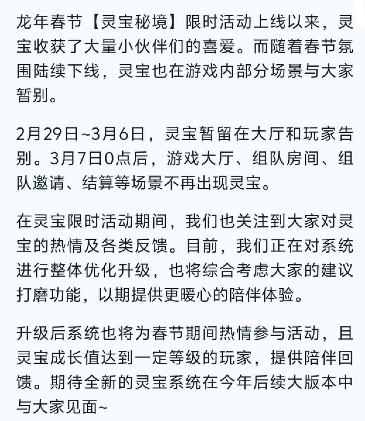 官方称3月7号之后灵宝活动就会彻底结束,游戏大厅、组队房间还有组队邀请界面都不会出现灵宝,想要看灵宝只能去自己的个人主页。