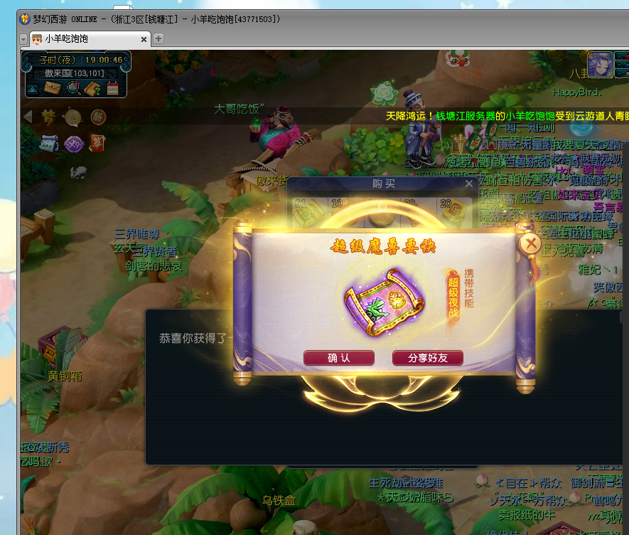 云游道人登场后,不少服务器的小伙伴都开启“买买买”模式。这不,钱塘江服务器就有位运气不错的小伙伴在购买高魔诀时,意外出了一本“超级夜战”。