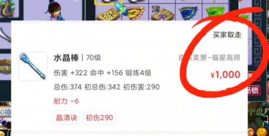 近日,有位冲刺【福星高照】服务器的小伙伴在鉴定装备时候出了一件70级初伤290的晶清棒子,并以1000R的价格成功成交。