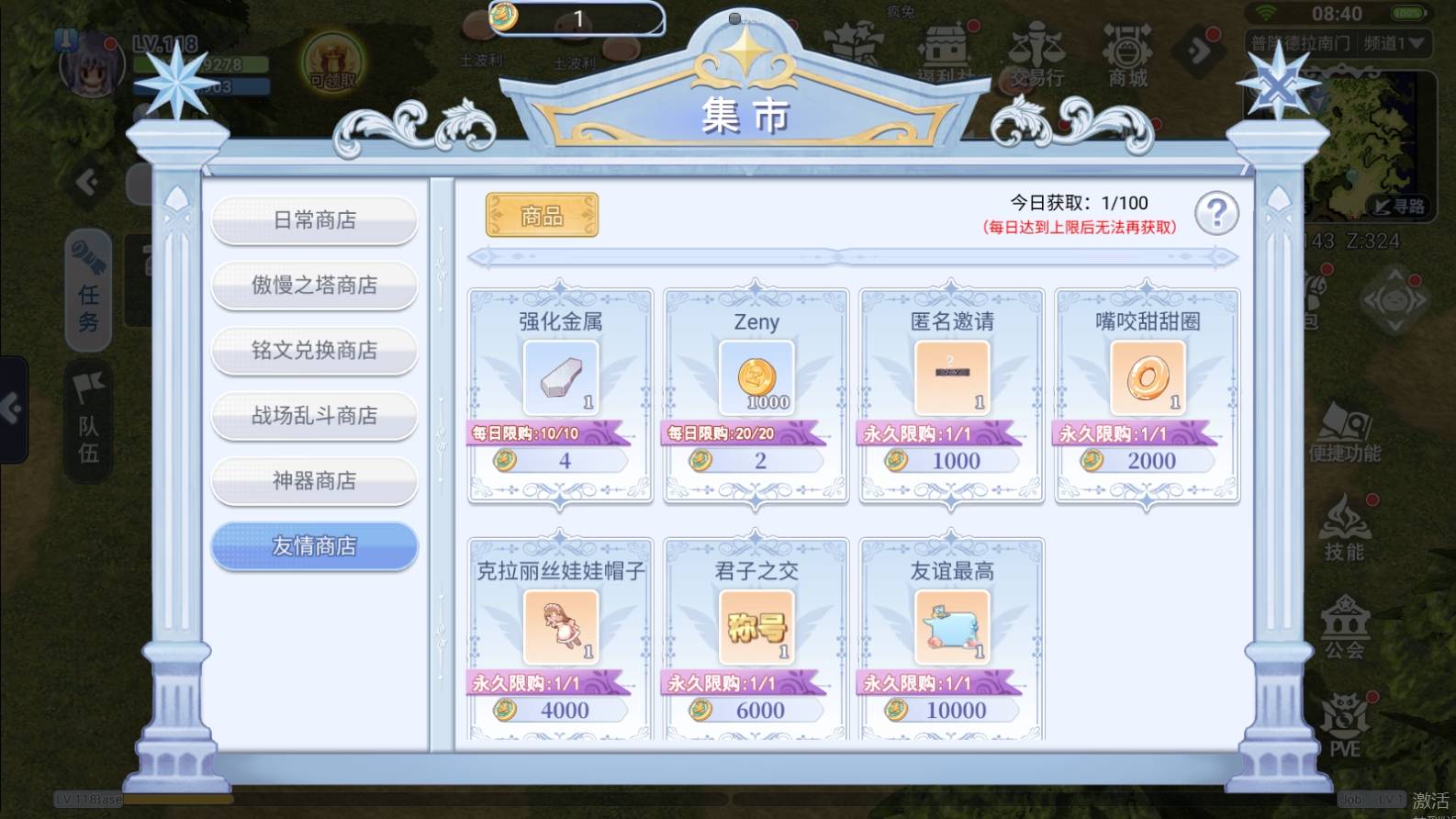 玩家可通过「集市」进入「友情商店」兑换各种物品,包括强化金属、金币、时装头饰、称号、聊天气泡框等。