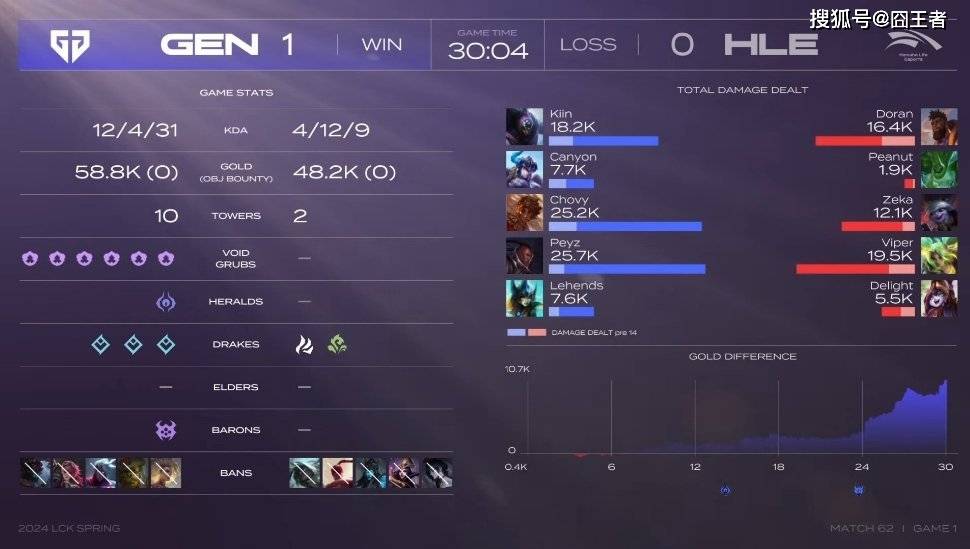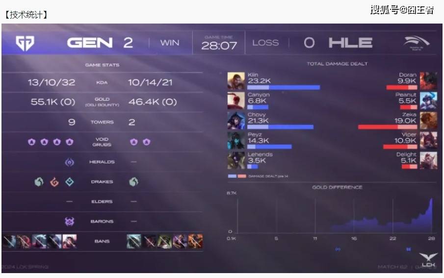 结果两队在第一局比赛里面,打出了一局典型的LCK式运营对局。韩华拿下一血后,并没有乘势打出前期优势,反而是GenG利用上野联动,频繁击杀奎桑提,将上路打成了突破口,掌控了场上的节奏。比赛进入中后期,两队依旧没有产生太多的团战和击杀。最终30分04秒,GenG在下路战术撤退,吸引韩华追击后,一波反打,先赢一局!
