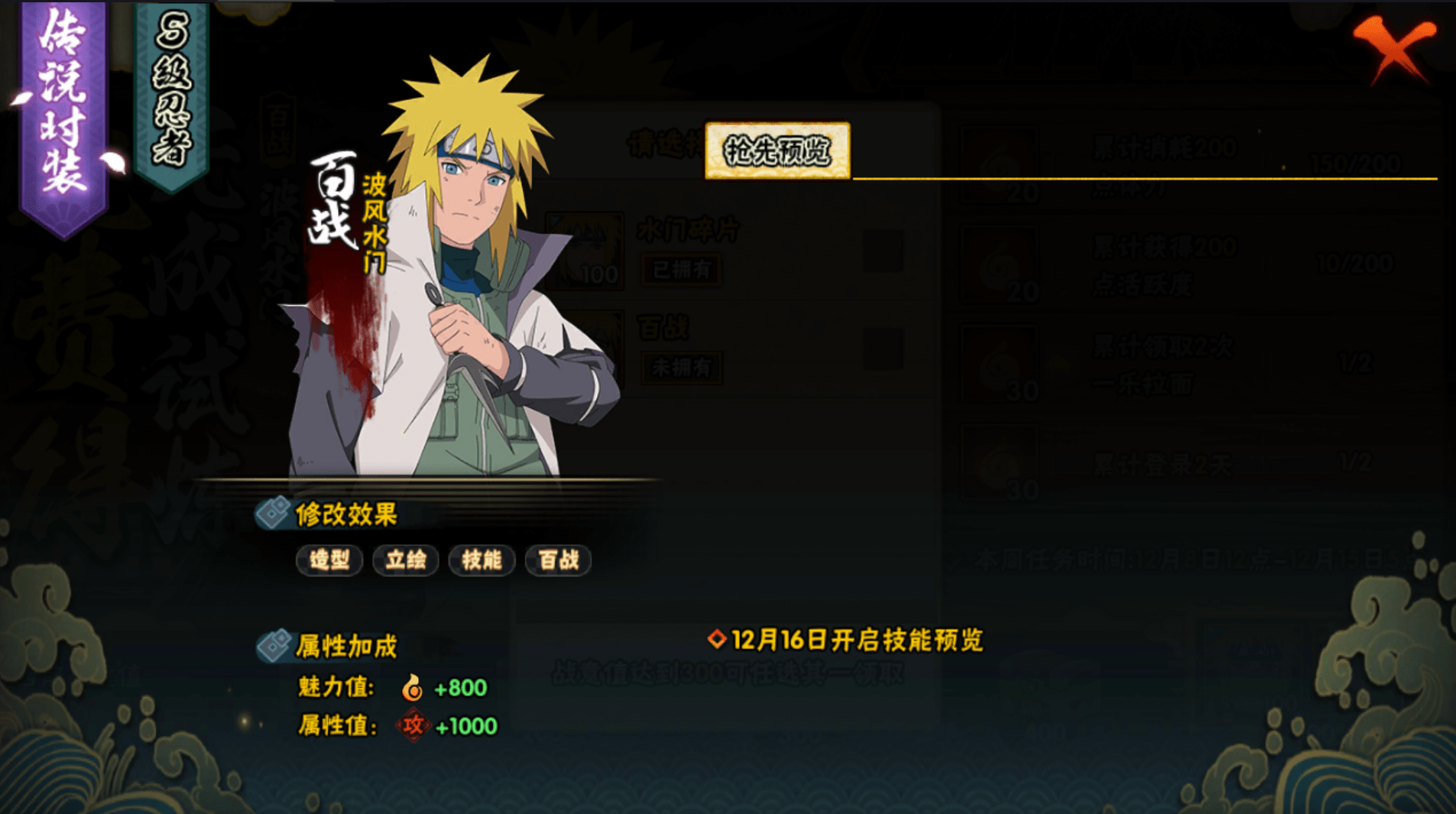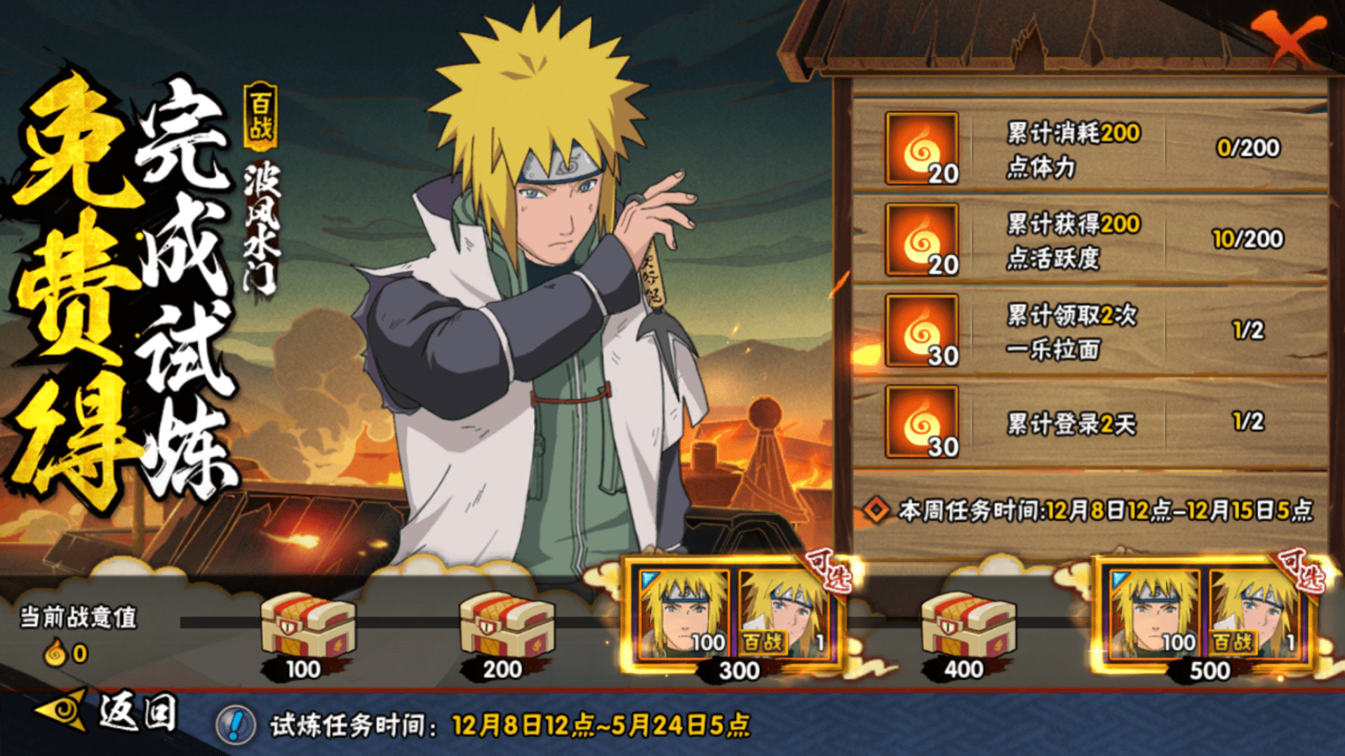 百战试炼的四个任务门槛都比较低,但会有登录天数的限制,所以会让你在一天时间内无法全部完成,至少需要两天才可以拿满。每周拿满的战意值是100,可以解锁一个奖励,一共是有五个奖励,拿满所有奖励就需要做满五周的任务,第三个和第五个奖励都是S忍水门整卡或者是时装二选一。不过因为任务的门槛较低,完成的速度比较快,所以,正常情况下最快拿到时装的时间是在23号,也就是在第三周刷新了任务后的第二天就可以拿到了。