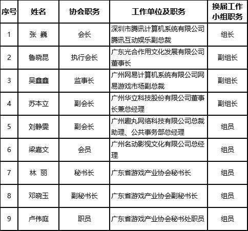 会议第三项议程,审议成立协会换届工作领导小组。广东省游戏产业协会第二届理事会将于2024年9月任期届满,为了确保换届选举工作的顺利进行,根据《广东省社会组织换届选举工作指引(试行)》《广东省游戏产业协会章程》规定,拟成立协会换届工作领导小组,以指导和协调整个换届过程。经表决,本次会议审议通过议案,换届工作领导小组名单如下: