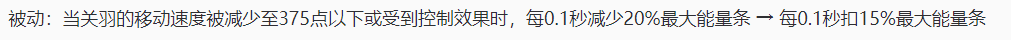 而此次的版本更新,将会让关羽在受控或者受减速时,降低能量的幅度从原来的每0.1秒减少20%最大能量改成15%,使得关羽有更多的机会跑起来。