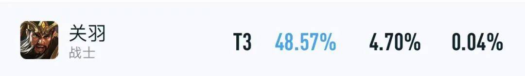 也正因如此,关羽目前的巅峰赛数据,才会只有48.57%胜率+4.7%出场率,排在了对抗路榜的下游,强度也只能徘徊在T2~T3之间。