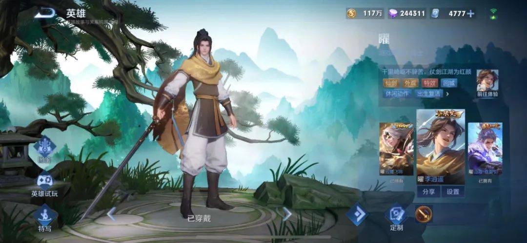 曜的李逍遥是跟《仙剑奇侠传》联动的皮肤,于21年6月上架,品质为传说限定,整体的模型和特效都比较不错,其中,也还原了大量的原著技能,如万剑诀,酒神咒,天剑和剑神,充满了童年的回忆。