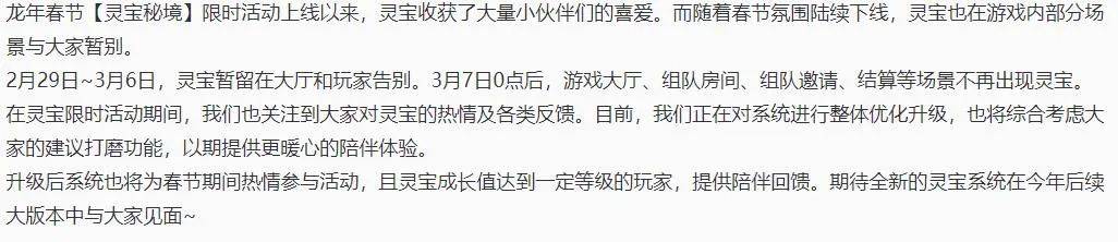 在3月7日0点后,灵宝将不会在游戏大厅,组队房间,组队邀请和结算等界面出现,不过,策划也表示了,后续会对灵宝系统进行升级优化。
