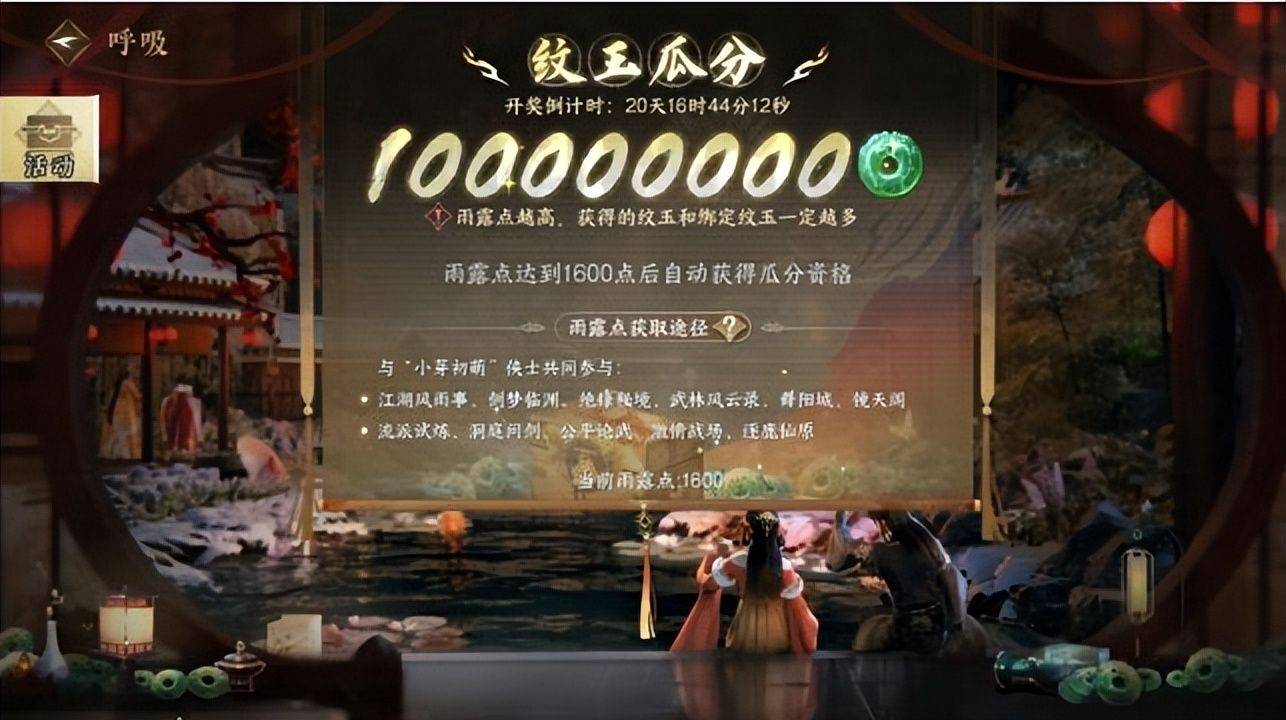 此外,如果小伙伴们与带有“小芽初萌”的同伴一起参与各种活动和玩法,可以积累雨露点哦,届时可以瓜分1亿纹玉和若干绑定纹玉!!!也就是获得雨露点达到1600点时,就能参与12月31日晚22时的全服纹玉瓜分活动~