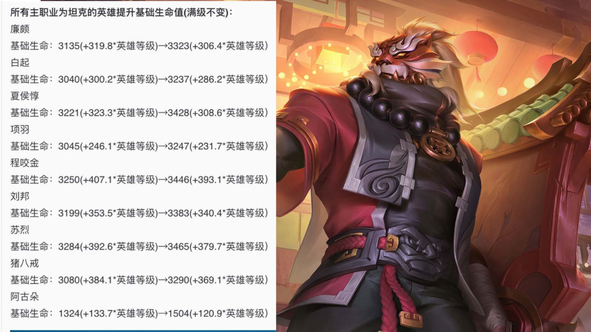 然后再来看一下坦克英雄的调整,坦克英雄的改动并没有调整技能,只是优化了生命值。