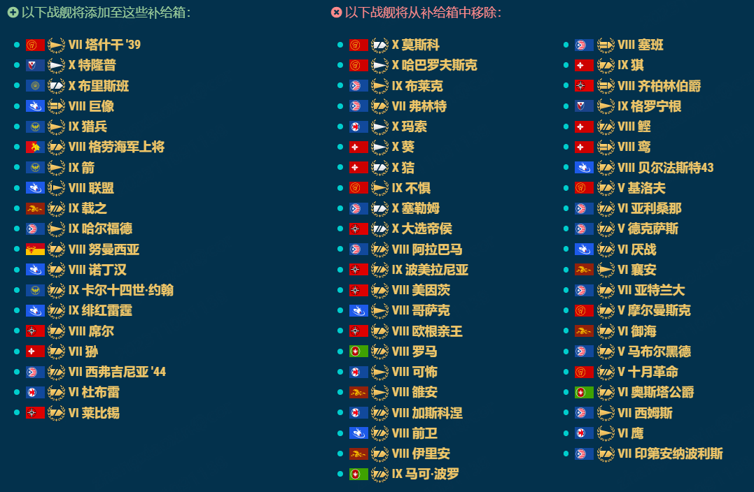 这些补给箱中含有大量金币、煤炭、精英指挥官经验、船位以及战舰高级账号天数等奖励,不过大家最看重的还是其中的大量战舰,尤其是X级战舰和稀有战舰。值得一提的是,今年补给箱中不但新增了19艘广受好评的新战舰,还移除了40多艘旧战舰,大家更容易开出心仪的战舰。