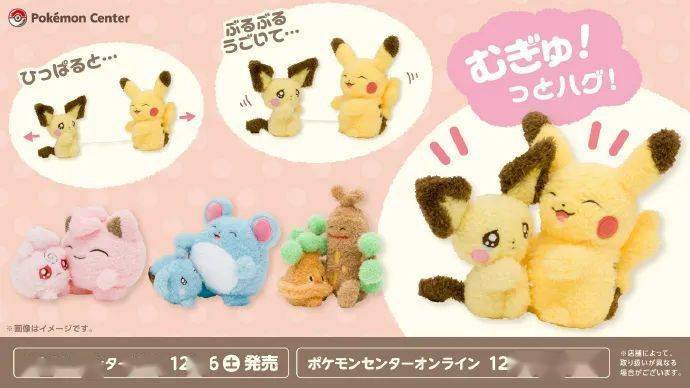 12月16日(星期六),「发抖…紧紧抱!毛绒玩具」将会在宝可梦中心登场!拉动进化前的宝可梦,它就会开始颤动,然后和进化后的宝可梦拥抱。比如皮丘和皮卡丘,共有4种不同的系列哦!宝可梦中心线上商店将于12月13日(星期三)10时开始登场这些商品!