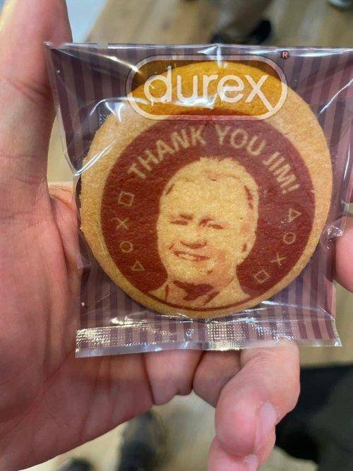 典礼结束后立马有玩家借题发挥,拿索尼的拉跨表现开涮,正巧昨日索尼SIE为即将卸任的总裁兼首席执行官吉姆·瑞恩举行了送别派对,玩家将欢送会上印着其头像的饼干P成了杜蕾斯……