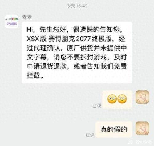 《赛博朋克2077》实体终极版现已推出,不少玩家也第一时间购入,但近日有玩家反映自己收到了卖家要求退款的信息:据称原厂供货并未提供中文字幕,请玩家不要拆封并申请退货退款。