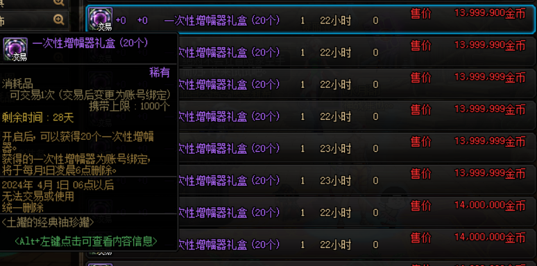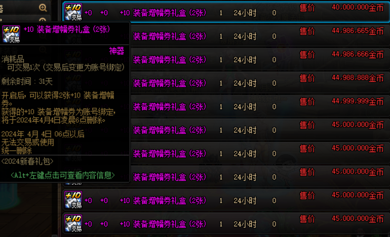目前跨3A拍卖行新春礼包内的+10增幅券2个装价格在4000-4500金币左右,大约2500W一张增幅10,相较于平时也是便宜不少。如果实在是没啥信心,直接买也不成问题。