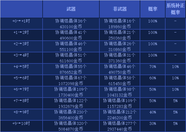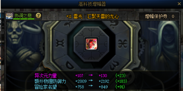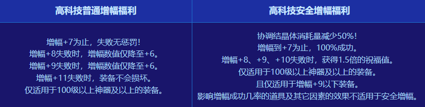 活动期间利用高科技增幅器进行安全增幅+7为止都是100%成功的,协调结晶体的消耗也会减少50%。使用活动的安全增幅至+7的总花费固定为3271772金币和147个协调结晶体(非武器装备),这也是目前的最佳方案。