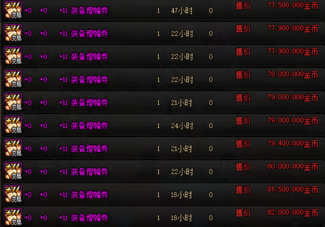 目前11增幅均价在8000W起步,价格过贵,如果只是为了上11的话,那么建议直接还是用上述思路,安全增幅到+7,然后增幅器+10,然后用活动增幅机器上11保证不碎。