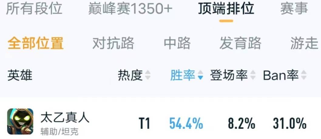第二个英雄就是太乙真人,没错,太乙真人作为辅助终于站起来了,目前太乙真人在全分段的胜率已经高达54.4,在全英雄的胜率中能排进前三。推荐大家可以拿太乙真人上分最主要的原因就是因为太乙真人其实并不需要太多的操作,只要意识到位,随便帮队友控制一下,然后丢个复活工作就算结束,简单轻松。