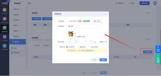 积分模式:单个红包最低金额为1元 ,每轮游戏中可设置奖品发奖范围,并添加多种奖品