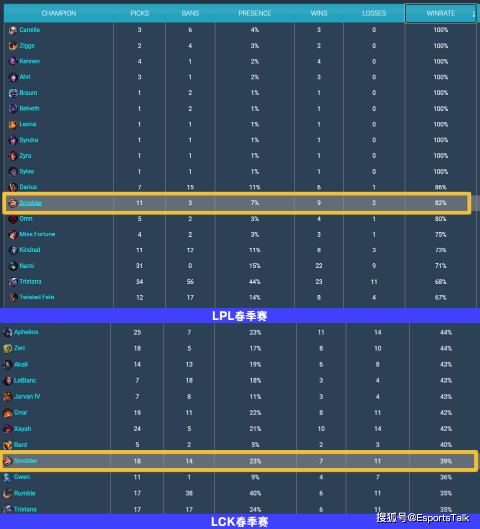 但与LPL截然不同画面的是,在最近LCK春季赛的赛场中,斯莫德的胜率却仅有39%,这就让我们很奇怪了,斯莫德并非是一位强调前线对线压制的英雄,为什么在LCK这个有着莎士比亚“美名”的赛区,斯莫德的胜率反而是大幅降低的呢?