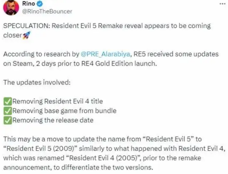 对于这一系列变动的解读,许多玩家和博主倾向于认为这是《生化危机5》重制版的预兆。他们的依据是,这一做法与《生化危机4》重制版发布前的操作有着惊人的相似性。在《生化危机4》重制版发布前,Steam平台上的《生化危机4》条目也经历了一系列类似的调整。这一相似之处让人们更加相信,《生化危机5》即将迎来它的重制版时代。
