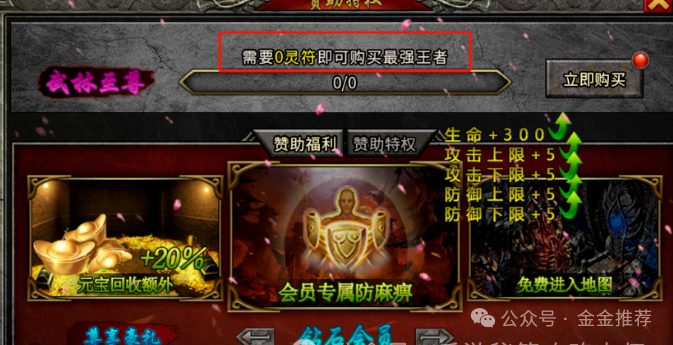 冰雪传奇的赞助共分五级:钻石、武林、王者、君临和骷髅大帝。玩家一登录游戏便可免费获得王者赞助,如有需求可联系客服完成任务获得兑换码,免费开通君临赞助;而骷髅大帝赞助只须花费人民币300元即可轻松获得!