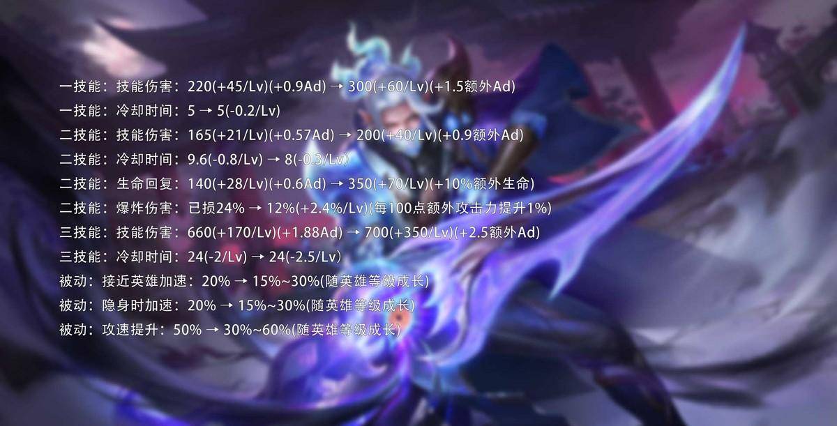 这一看其实就很明显了,让英雄的强度曲线发生变化,前期弱一点后期强一点,总体来说算是降温吧,因为机制原因后期兰陵王不太好进场,机会比较少,很多时候都是当一个移动的视野,前期被降温还是很难受的。