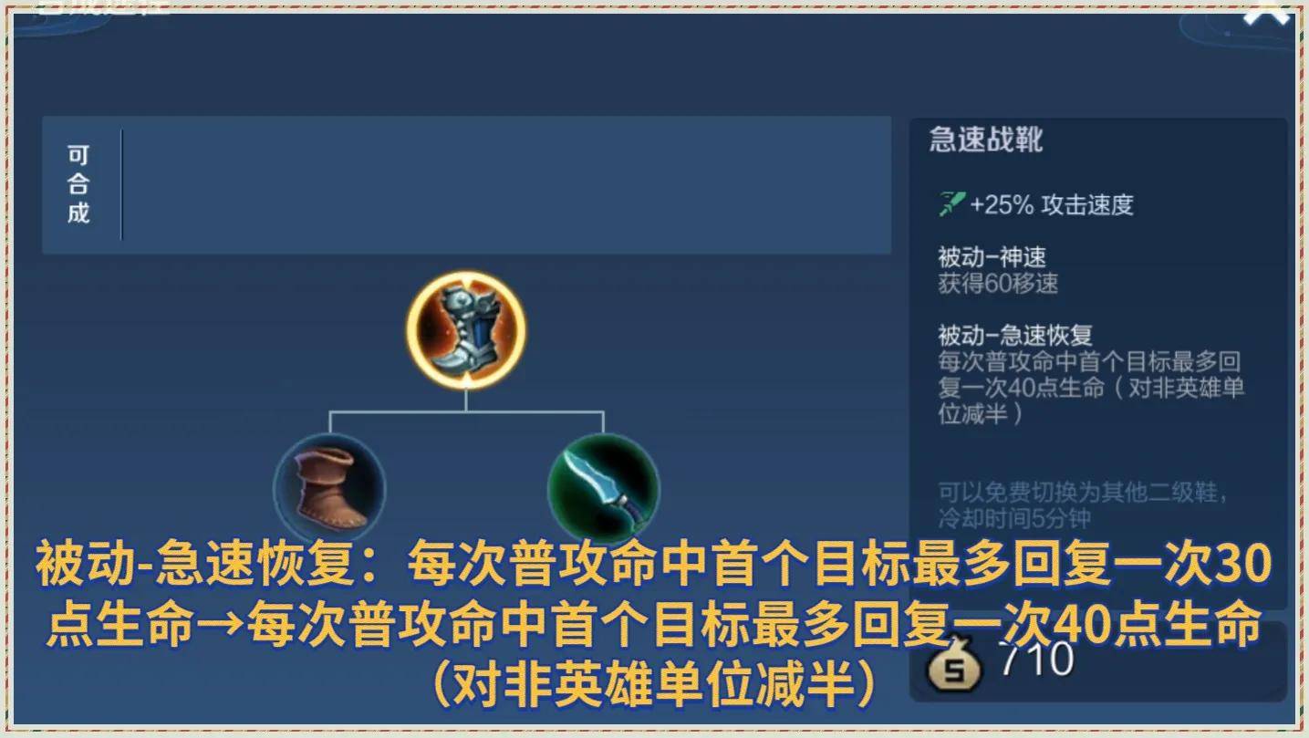 再有就是极速战靴。每一次普攻命中首个目标,最多回复生命值提高了10点,从原本的30提高到40,不过也新增加了一点限制,那就是对非英雄单位减半。