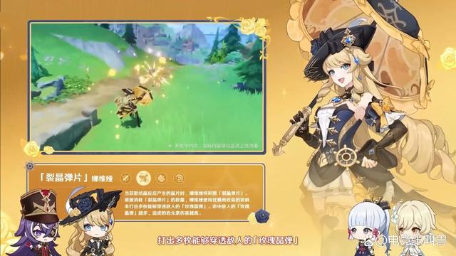 娜维娅定位岩系主C,技能核心是结晶反应产生的晶片:全队角色获取结晶反应产生的晶片时,将为娜维娅积攒1枚“裂晶弹片”,最多积攒6枚。