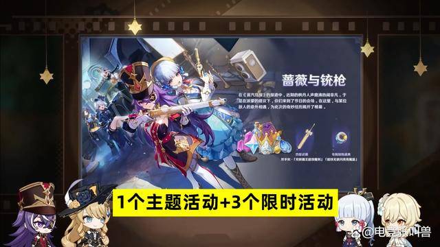 4.3版本主题活动“蔷薇与铳枪”,主要包括千步拦射角分间(射击)、幻光奇技实录(战斗)、极限驱策法(积分)、巧像入帧(拍摄),完成活动可以获得760原石,以及4星武器【究极霸王超级魔剑】。